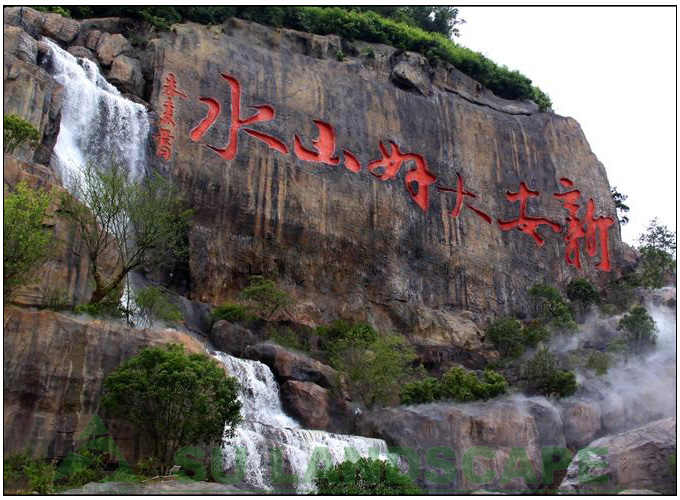 项目概况:“新安大好山水”艺术景观工程位于黄山市屯溪区尤溪九龙山,含巨型塑山、摩崖石刻、雕塑、瀑布、绿化、亮化的深化设计施工;崖壁面积一万多平方米。苏氏山水以徽文化为主题。对地质灾害整治山体坡面进行艺术化的设计及施工。