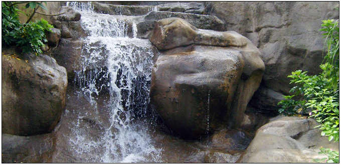 假山瀑布景观的美景构成,往往离不开周围景观的协调。在瀑布周围,那些原始、粗犷的“天工开物”——神姿仙态的山峰与褶皱多姿的塑石,春冬之时,则素湍绿潭回清倒影。瀑布周围多植被树木,,悬泉瀑布,飞漱其间,清荣峻茂,良多趣味。往往是假山瀑布环境不可分割的组成部分,对增强瀑布风景区的美感有着强烈的辅助作用。茵特拉根酒店假山瀑布,其美景的形成,也是得于山、林,植物、水这些天造地设的自然景观的陪衬的。茵特拉根假山瀑布,四周峰峦叠障,林木浓郁,山影松姿,天水相连。每当夕阳西下,先是烟霞四起,一层薄雾如轻纱般笼罩山峰。继而月眉东升,又是清辉满湖。月光朦胧,花草朦胧,山也朦胧,夜幕朦胧,既优雅,又幽静。别有一番奇观幻景之感。