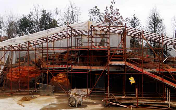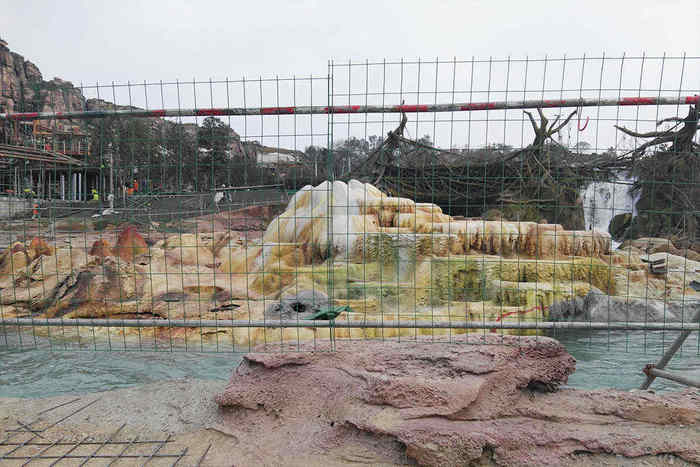 我们从上图可以清楚了解到迪士尼假山采用的是直塑式假山,而没采用成本较低的GRC假山。这大大增加了工程难度,首先根据现场场景设计方设计出结构图,在制作过程中迪士尼要求高质量、仿原生态设计,grc假山虽然很轻便,但是在这里却不适用,其一、grc假山需要有牢固的基座,其二、grc假山以轻便著称,在水流冲击和碰撞容易出现安全隐患,因此,综合考量后决定采用直塑模式,直塑首先解决了安全问题,直塑是把钢筋置入与山岩或水泥深处,大大增加受重和承压能力,其次通过钢筋结构封装后二次抹灰喷浆,增大混泥土厚度,根据施工图纸每个区域的塑形也是极为重要。