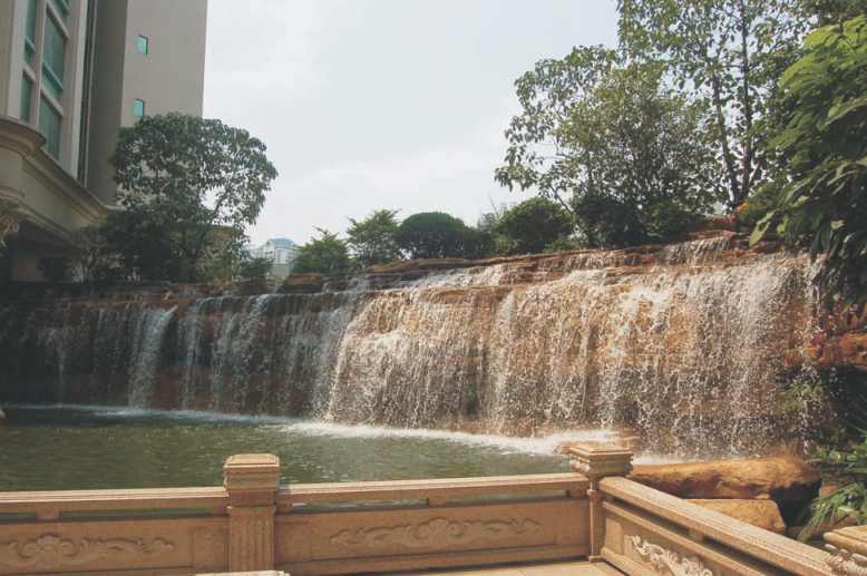 项目概况:南方国际广场位于深圳市会展中心对面,是壹个由五星级酒店及商务住宅组成的全新高级社区,其广场瀑布景观为苏氏山水设计和施工,整个景观与社区环境自然融合在一起,成为当时国内最大的屋顶瀑布景观。瀑布呈半月环抱中庭之态,幅宽达80余米,高5米,左侧从住宅建筑下延伸出来,假山壁造型别致而气势恢宏,高低起落、凹突多变的风格赋予了瀑布流水大自然的灵动于美感。瀑布功率全开时,浩浩而落的流水如水帘、如银缎,洒落在中庭水潭之中,给人以闹中取静的生态自然气息,搭配上大大小小枝繁叶茂的各式绿植,只让人顿生苏氏山水夺大自然鬼斧神工之秒。