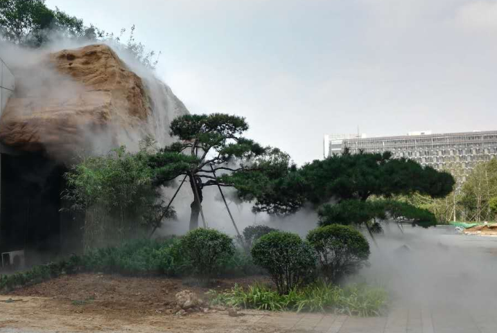 项目概况:2017年年初,济南高新技术控股公司新规划的高新区地产业进入收尾阶段,而作为其门面的广场依然略显单调,规划中的假山水池景观区域仍是一片空白,根据其设计思路和要求,一时难以找到能满足其时效性和质量标准的承包商。在偶然的机会下,项目负责人获悉苏氏山水在假山瀑布领域的专业实力,立刻带着外方设计师奔赴深圳与苏氏山水公司面谈。经过几轮的沟通探讨,苏氏山水大胆抛弃了外方原有的设计,另出了一个攫人眼球,气势与韵味并具的假山水景。短短两个月内,平地而起的是一块如天外飞来的巨大黄石,石顶云雾缭绕,不知从何而起的涓涓瀑流撒落而下,溅落在石体之上,汇聚成一池清潭,四周奇松点缀,与石水相映,石奇,水美,松傲,构成了一幅让人回味无穷、美不胜收的山石水景。