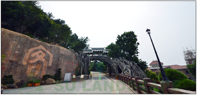 According to the local conditions, Su Landscape builds the tree following the small mountain at the entrance, and put artificial rocks on the slope with stone inscription. The artificial tree having deep root and luxuriant leaves occupies the cliff, which has decorated the entrance classical and natural. The tree represents the root of the Hakka, and strong root system symbolizes their spirit of seeking origin.