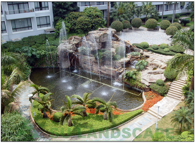 Kylin Viua VIP House has a 45°angle slope in the courtyard, which made a convenient platform for Su Landscape''s design. Based on the slope, Su Landscape made a triple rock group protruding to the water face, and two various stream twisted among them: one slowly flowed as the multistage goes, another follows the single rock stage and falls right down at the cliff. This project got a highly speak from the Kylin Hotel and the city reception office.