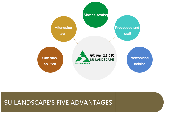Coming from modern city’s prosperity and extracting the delicate of the mountains is features of Su Landscape’s art works. Su Landscape has reputation for its nature verve art works and its considerable after-sales- service. Good after sale service is the bridge connecting customers with the company. Besides it is a magical way to show the charming of the company.