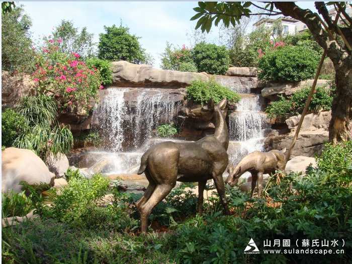 现代园林的塑石假山.假山瀑布,体现了较强形式的综合性艺术的人文之美,是以物理要素构成为基础,以文学、书法、绘画等艺术综合为依托,从而给人以丰富多彩的审美享受,是取意于诗、取意于画的艺术创作,可以引发人们产生丰富动情的审美联想。时间和空间是一切实体的存在形式,是指物质形态的并存序列与交替序列,而时间与空间又相互依存、相互渗透,不可独一而存。苏氏山水(山月园)的艺术表现同样如此,不可能离开那“四维平直时空”之美,塑石假山也不例外。塑石假山.假山瀑布景观美的,人文之美具有很强的艺术综合性与社会历史性。