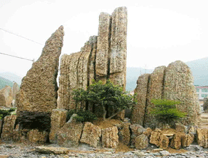 石筍石:多为淡灰绿色、土红灰色或灰黑色。质重而脆,是一种长形的砾岩岩石。石形修长,立于地上即为石笋,顺其纹理可竖向劈分。 |