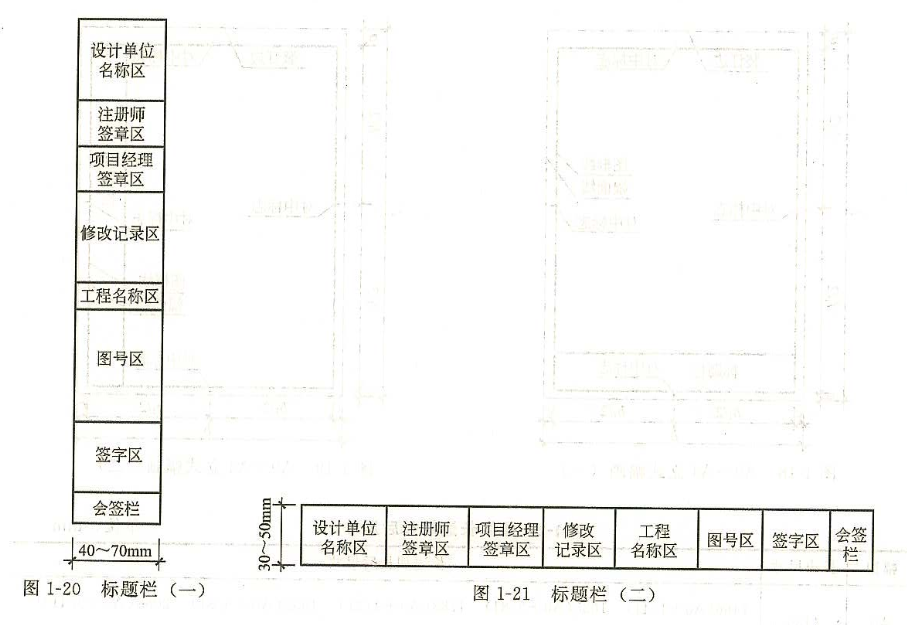 ②标题栏。标题栏应符合图1 20、图1-21的规定,根据工程的需要选择确定其尺寸、格式及分区。签字栏应包括实名列和签名列,并应符合下列规定。