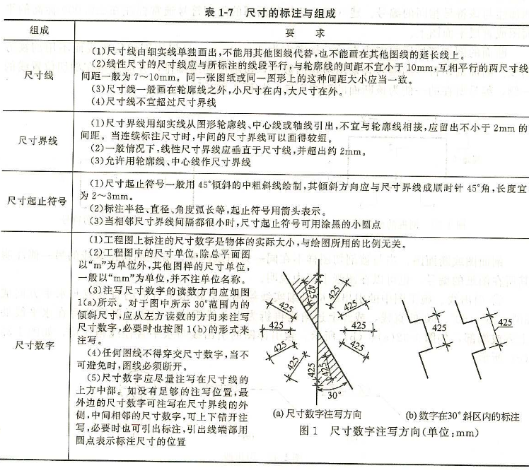 (6)尺寸标注。尺寸的标注与组成,见表1-7。