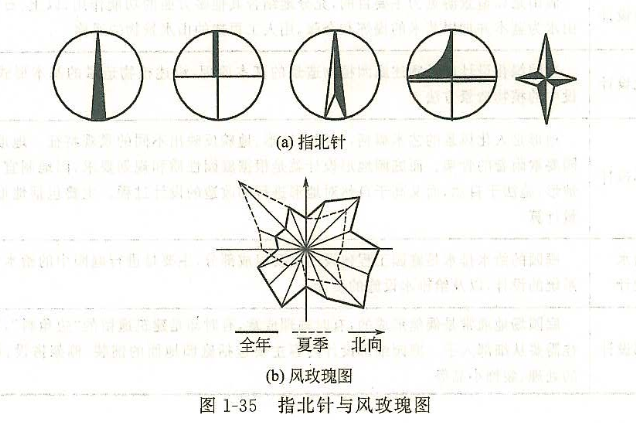 风玫瑰图是指根据某一地区气象台观测的风气象资料绘制出的图形,分为风向玫瑰图和风速玫瑰图两种,一般多用风向玫瑰图。风向玫瑰图表示风向和风向频率。风向频率是在一定时间内各种风向出现的次数占所有观察次数的百分比。根据各方向风的出现频率,以相应的比例长度,按风向中心吹,描在用8个或16个方位所表示的图上,然后将各相邻方向的端点用直线连接起来,绘成一个形式宛如玫瑰的闭合折线,就是风玫瑰图。图中线段最长者即为当地主导风向。粗实线表示全年风频情况虚线表示夏季风频情况,如图1-35(b)所示。